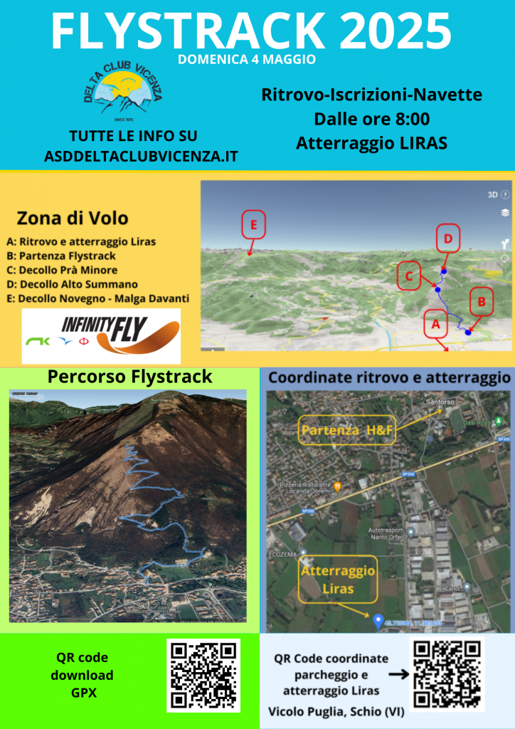 Nell’ atterraggio LIRAS di Santorso, una festa del volo coi fiocchi. Ti piace l’Hike&Fly? o ti piace arrivare in decollo praticamente cadendo dalla navetta? Non te ne frega nulla del parapendio perchè tu voli con il Delta? Puoi venire anche tu, perchè l’unica cosa su cui siamo discriminanti sarà la voglia di incontrarci con altri appassionati di volo. Se ti piace l’H&F, beh il nostro Summano è li a portata di mano, sfrutteremo l’ottima organizzazione della Maistrack (storica gara vertical di km verticale di 1000d+ in 3,5km) per arrivare fino a Prà minore (780m), da lì si decolla a caccia del volo più lungo di giornata e se battete il record del decollo, potrete vincere il jackpot!!!! (INFO) . Se poi sarà solamente “planabile” beh vorrà dire che ci sollazzeremo in atterraggio tra un panino e multipli di una birra. NON SIETE AMANTI DELL’H&F? Non preoccupatevi, puntiamo a metter su qualche Navetta per il decollo alto del Summano per i Para o il Novegno per i Delta, per tutti gli iscritti, maglietta evento, panino e bibita! Abbiamo 40 magliette, vi consigliamo di prenotarvi perchè chi lo farà avrà la prelazione in caso di affollamento. (LA PRENOTAZIONE NON E’ VINCOLANTE MA CI CONSENTE DI ORGANIZZARCI MEGLIO, quindi se quel mattino vi svegliate storti perchè avete fatto baldoria la sera prima, non serve disdire o altro, semplicemente non vi presentate e STOP)