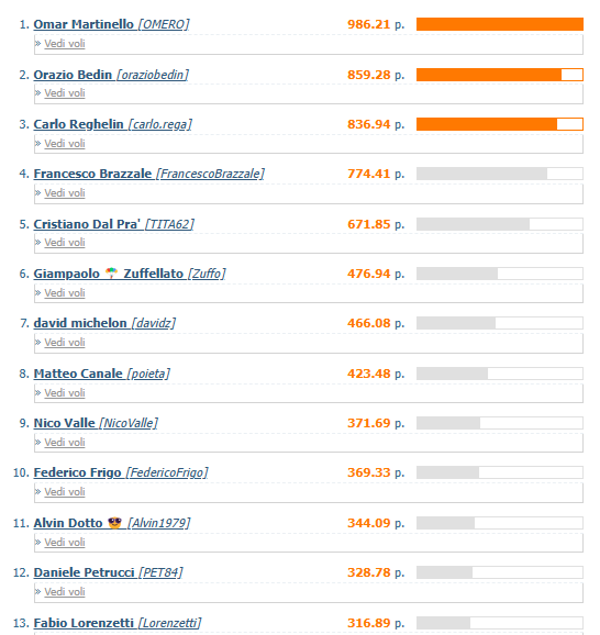 30 iscritti nella categoria PARA e 3 nei Delta, dove svetta Davide Zaltron, autore di un bel volo da 98 km da Bassano il 30 aprile. Lo segue, a soli 5 punti, Manuel Baldin con un volo valido da 23 km. Chiude la classifica Roberto De Munari.